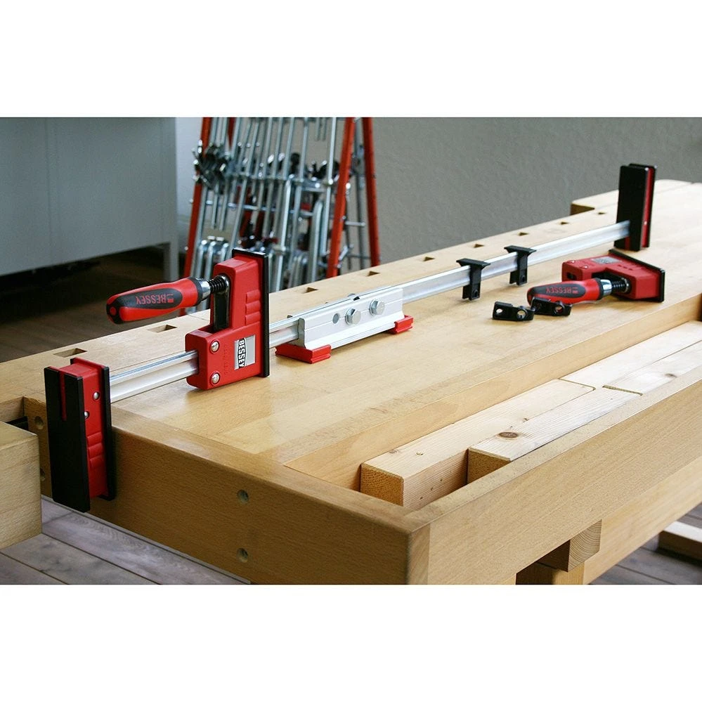 Get the most out of your clamps with this versatile clamp pack from Bessey. It bundles two 24” clamps with two 50” clamps and two connectors that let you combine clamps for extended capacity. Bessey’s K Body REVOlution parallel clamps boast more clamping force than their predecessors—up to 1,700 pounds per clamp. In addition, you can apply force with a 6mm hex key in the socket at the end of the handle—ideal for users with wrist issues. Dual anti-slip protection prevents unexpected jaw release, while the extra-large clamping surfaces stay at a right angle to the rail, making them ideal for keeping drawers and case goods square, as well as for standard panel glueups. All four edges of the clamp face can be used for clamping: standard full jaw, laying on either side, or upside down clamping with the heel—ideal when you don’t have enough space on the workpiece, or beneath it, to use the whole clamp face.