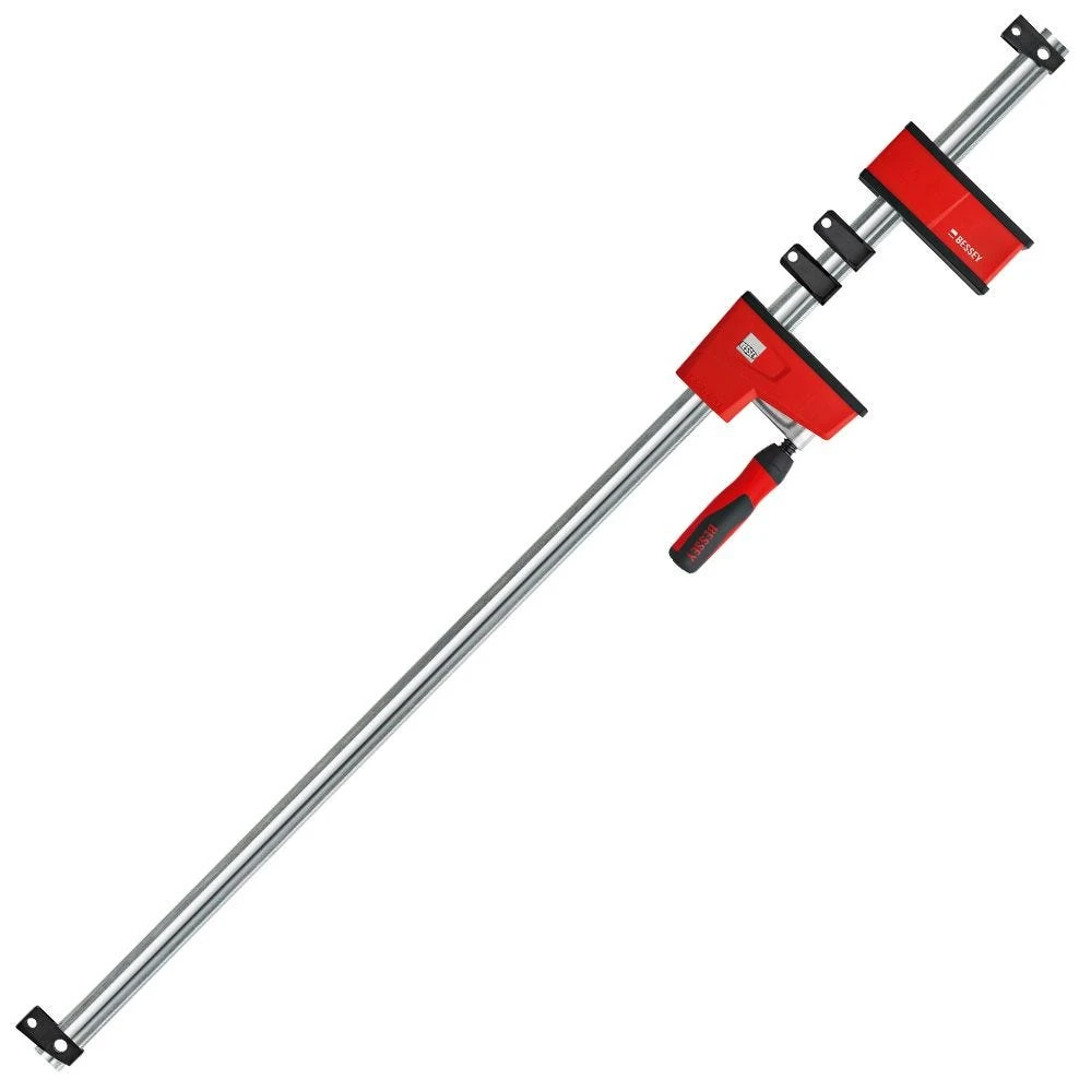 Bundle and save with this clamp package from Bessey! Package includes (2) 24” and (2) 50” clamps, plus (4) KP 90° clamping blocks for easy rectangular assemblies. Bessey’s K Body REVOlution parallel clamps boast approximately 1,000 N of additional clamping force over their predecessors. In addition, you can apply force with a 6mm hex key in the socket at the end of the handle—ideal for users with wrist issues. Dual anti-slip protection prevents unexpected jaw release, while the extra-large clamping surfaces stay at a right angle to the rail, making them ideal for keeping drawers and case goods square. All four edges of the clamp face can be used for clamping: standard full jaw, laying on either side, or upside down, clamping with the heel—ideal when you don’t have enough space on the workpiece, or beneath it, to use the whole clamp face.