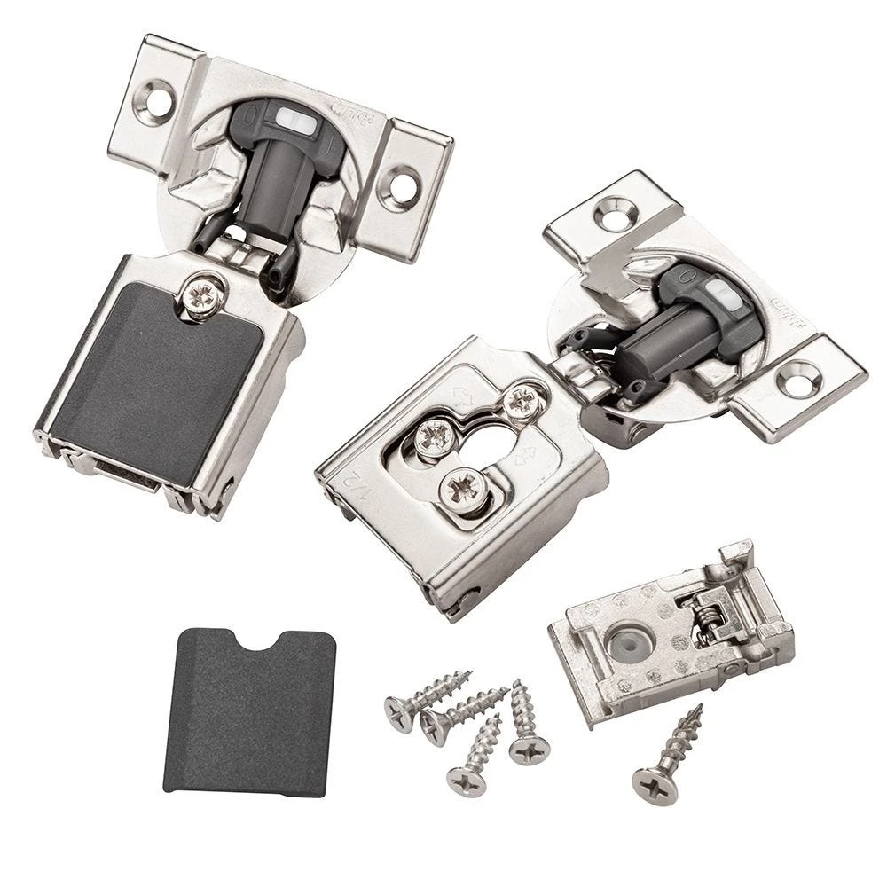 Blum’s overlay Compact Clip hinges bring you all the premium features of a long-arm Euro hinge—clip-on mounting and demounting, soft-close action and 3-way cam adjustments—in a compact package that looks great, has an attractive price, and won’t take up space inside the cabinet. Since Compact Clip hinges arrive pre-clipped onto the plates, with the mounting screws pre-started, mounting them couldn’t be easier. Once mounted to the door, simply hook the hinges over the cabinet face and drive the two screws! With Compact Clip BLUMotion, the soft-close mechanism fits entirely within the hinge cup, maintaining the compact form factor. Each hinge has a switch for turning the soft-close feature off—often required for proper closure of small doors. Three-way cam adjustments for up/down, left/right and in/out let you align the doors perfectly with each other.