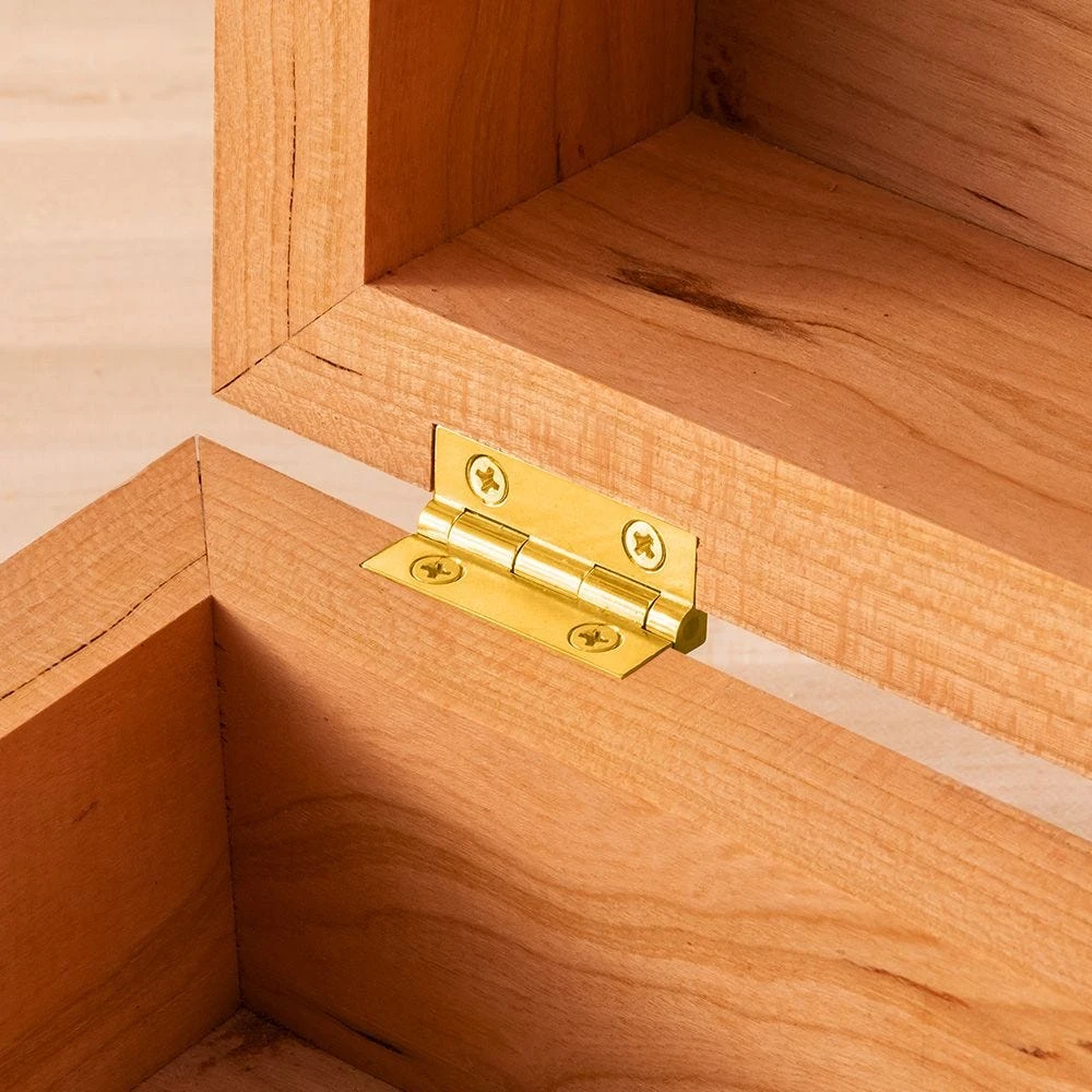 Working like a support, these solid brass hinges can hold lids open beyond a vertical position, up to 95°. Excellent for all small-box applications, including your most special products. Listed width per single leaf and in closed position.
