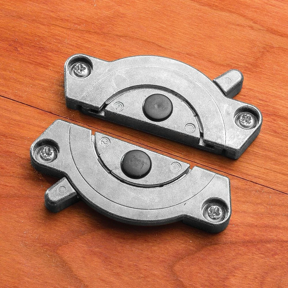 The Conny Tabletop Connector is an interlocking heavy-duty cast zinc mechanism that joins table tops, table leaves or any other set of flat panels together. It is simple to operate with an easy twist mechanism and locks firmly in place so leaves won’t slide apart or become misaligned. Use it on your furniture projects for the home, or use it around the shop to join infeed tables, outfeed tables, jigs and other accessory tables together for an uninterrupted sliding surface. Installation is easy—simply butt the two panels together and screw the Conny Tabletop Connector into place in its assembled form.