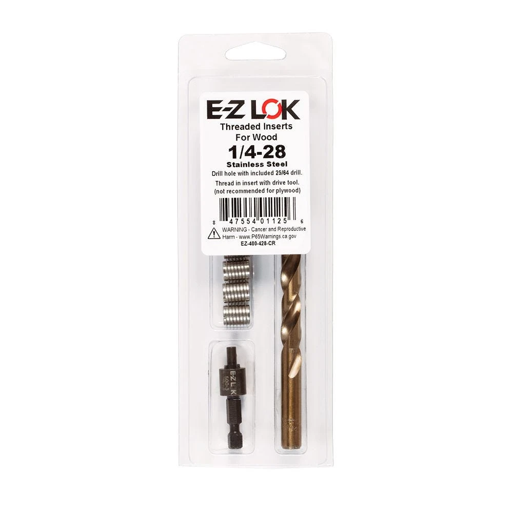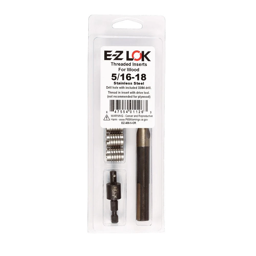 Everything you need to add strong, rigid machine threads to hardwoods in one convenient, easy-to-order kit. Also may be used to repair stripped holes where a wood screw was used previously. Kit includes a pack of threaded inserts, drill bit, and drive tool. Ideal for knock-down furniture or wherever you need a strong metal-reinforced joint in wood.