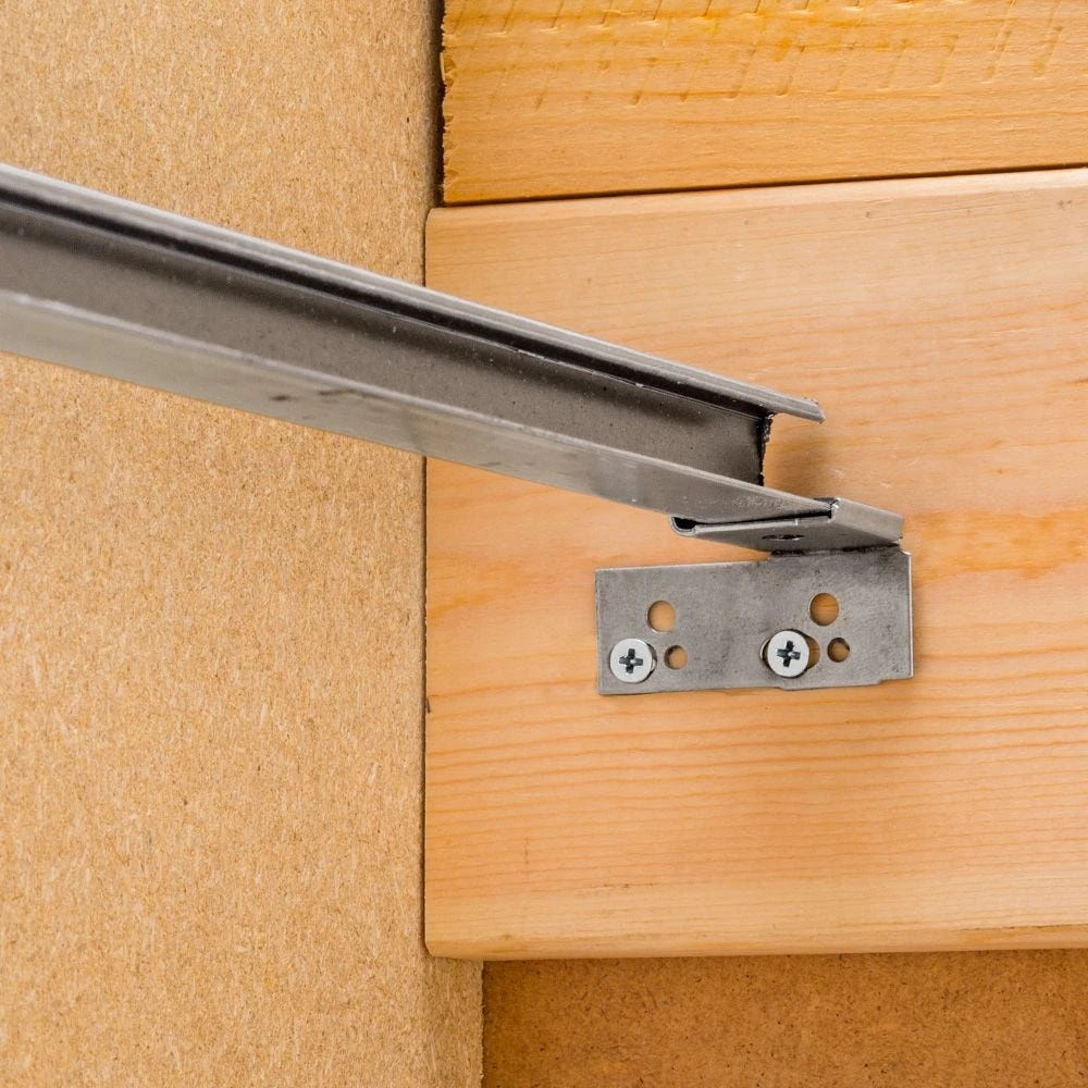 This type of slide has been used in millions of cabinets since being introduced in 1948. These slides can replace worn slides or be used as an affordable option in new cabinets. Slide length is cut-to-fit simply trim with a tin snips. Concealed installation. Needs only 1/8″ of side clearance for more usable drawer space.