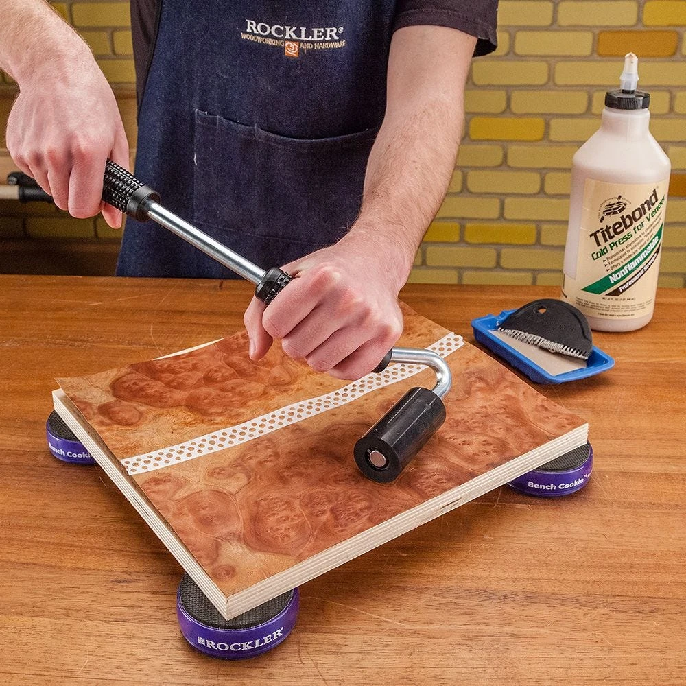 There’s something about the shape of this veneer roller that’ll really make you want to lean into it and apply a lot of pressure. By all means, go ahead! The specially contoured handle not only feels nice in your hands, it also refuses to bow under pressure. Designed specifically for applying laminates and veneers, it features a 3” roller with one flush end that allows you to easily work into the corners of boxes and cases.