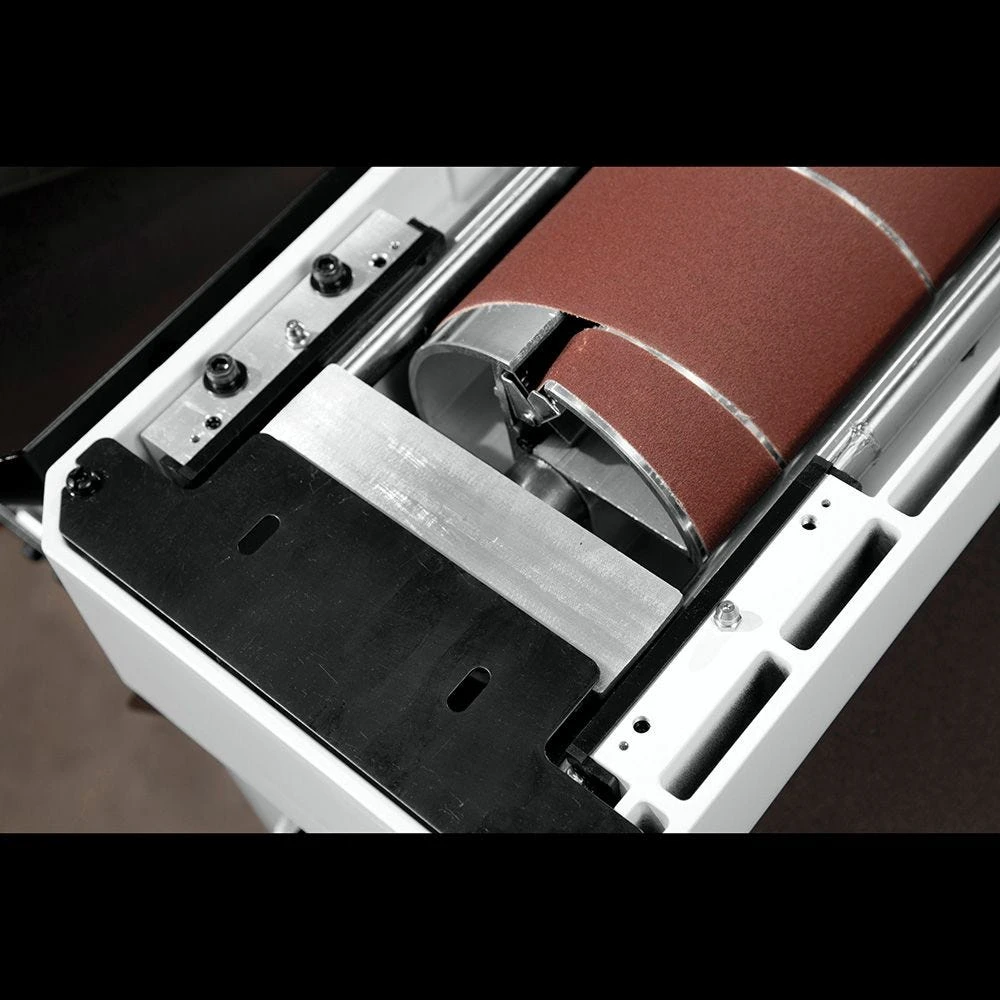 - Redesigned conveyor system pulls the workpiece through the sander instead of pushing