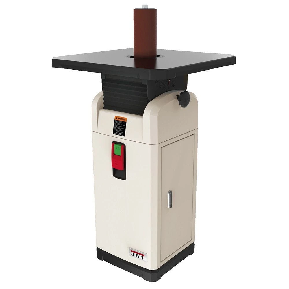 Thanks to a powerful 1HP motor, ten different spindle assemblies ranging from 1/4” to 4” in diameter, plus a full 1-1/2” of vertical oscillation, the Jet® JOSS-S Spindle Sander will make quick work of sanding a huge variety of inside curves. With its heavy-duty floor standing design and spacious table, even large workpieces can be handled comfortably, with minimal tipping. The table can be tilted up to 45° to the front and 15° to the rear for sanding beveled edges. All spindles conveniently store in a neat rack inside the cabinet. Special attention has been payed to optimizing dust collection on this sander, including a flexible baffle system beneath the table to direct dust into the ports. With its rugged construction and precision ball bearings, this sander is sure to be with you for the long haul.