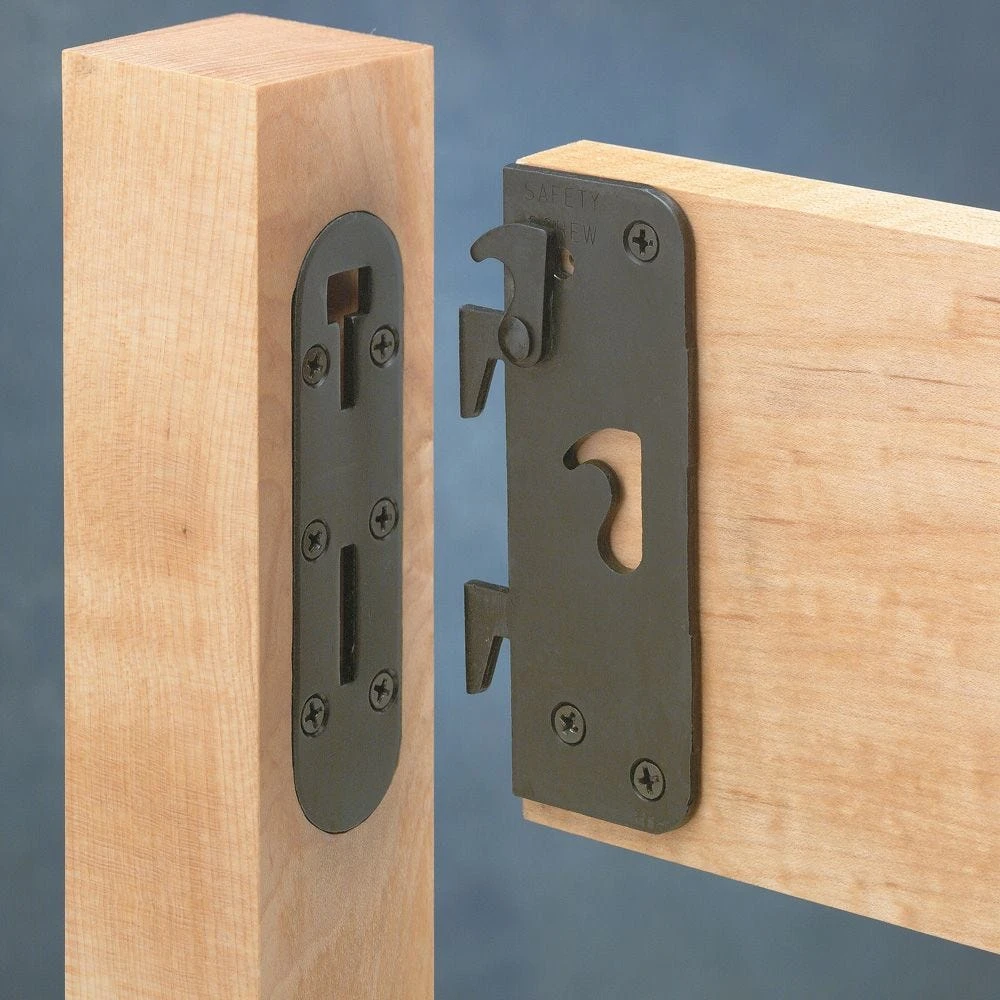 These locking brackets are safe, convenient, and secure. The interlocking safety latch prevents bed rails from becoming disengaged, while the 1/8″ thick steel construction adds strength. Assembly is quick and easy, you simply slide the two brackets together and insert the safety tab. Set includes enough brackets (8 parts) to complete one bed.