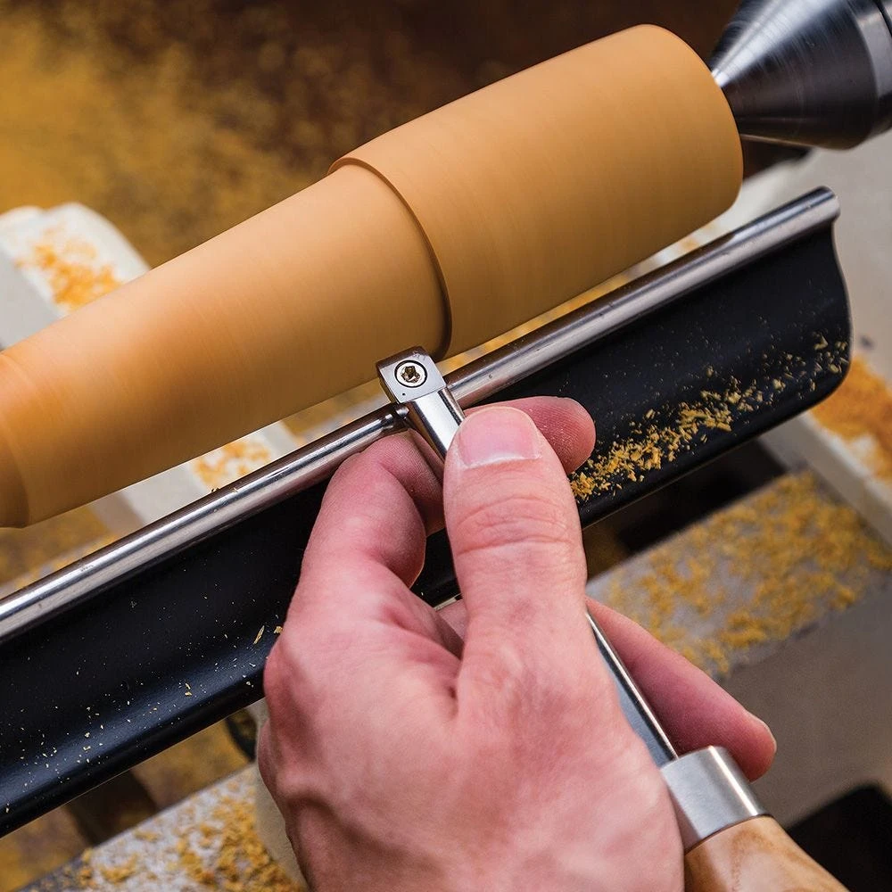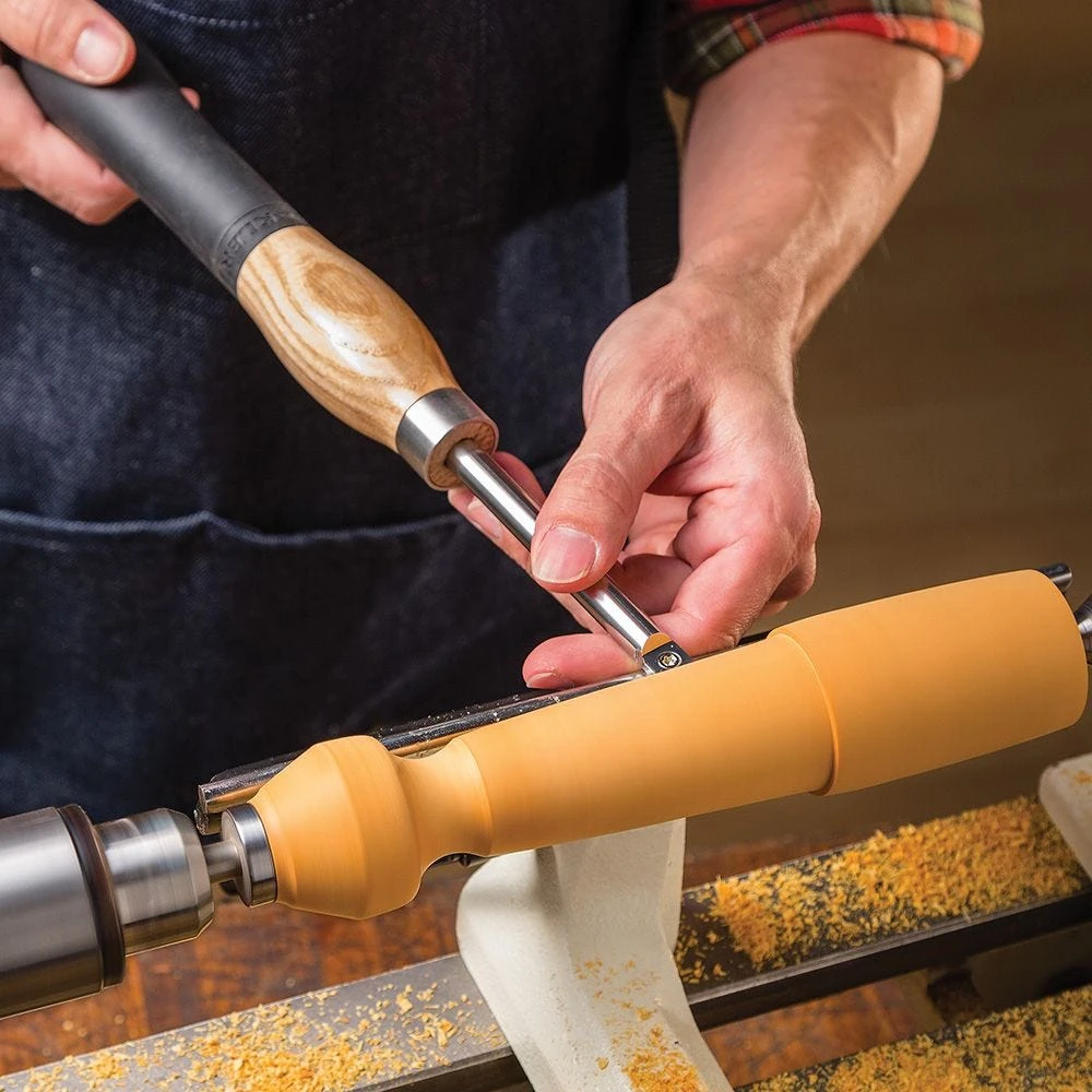 This Square Radius Carbide Mini Turning Tool from Rockler features a subtle 2” radius that works perfectly for smoothing cuts. Additionally, the replaceable, rotatable cutter eliminates the hassle and downtime of sharpening. Simply rotate the carbide cutter for a fresh, sharp edge, and replace it once all available edges have grown dull. The solid carbide cutter also stays sharp for longer when compared with steel, giving you a much longer useful life. Shaft features a flattened back for stability when using the tool rest. The handles are made of solid ash encased with a thick, molded rubber end for an enhanced grip and reduced fatigue.