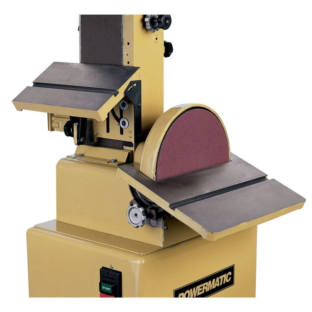 Loaded with features, the 31A from Powermatic can tackle the most demanding tasks. Full cast iron construction allows both metal and woodworking to be done on the same machine and the Integral Dual Dust Port keeps both belt and disc portions clean, extending abrasive life. The articulating table mounted on the 6″ x 48″ belt sander head can be used vertically, horizontally, or angled to accommodate diverse jobs. The belt head has an indexing pin with stops at 0, 45° and 90° and the head lock allows use at any angle in-between. Removing the top guard allows contour sanding and the cast iron tables with miter gauge slots and positive stops make set-up fast, accurate, and simple for any angle.