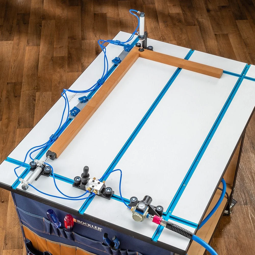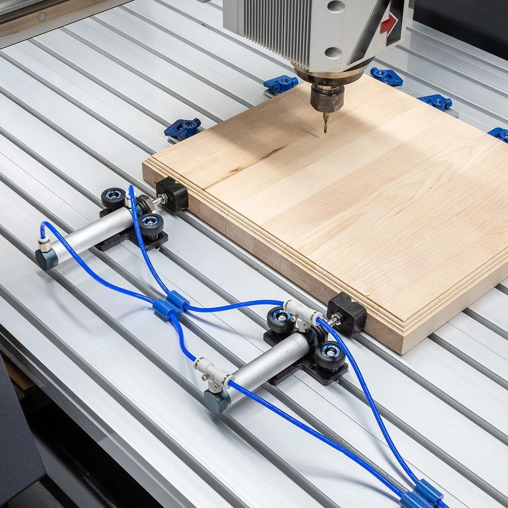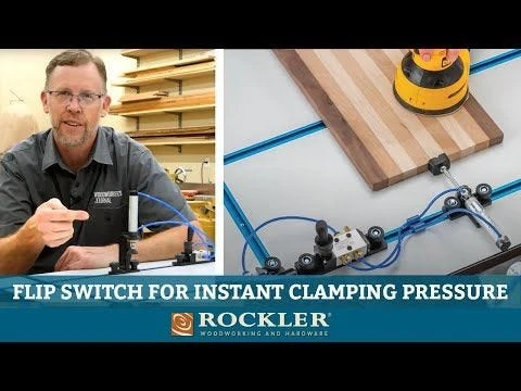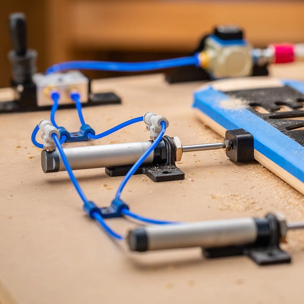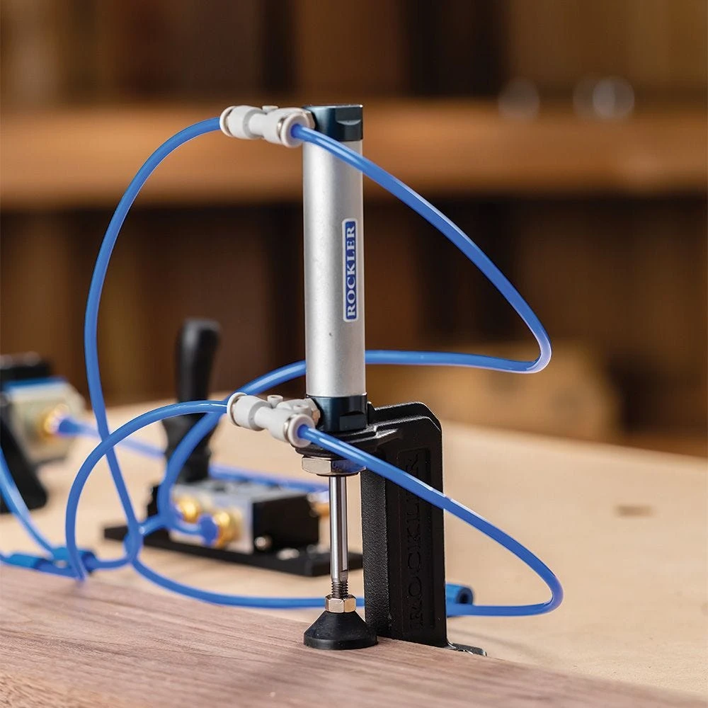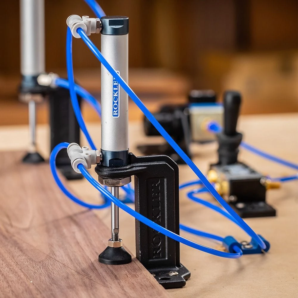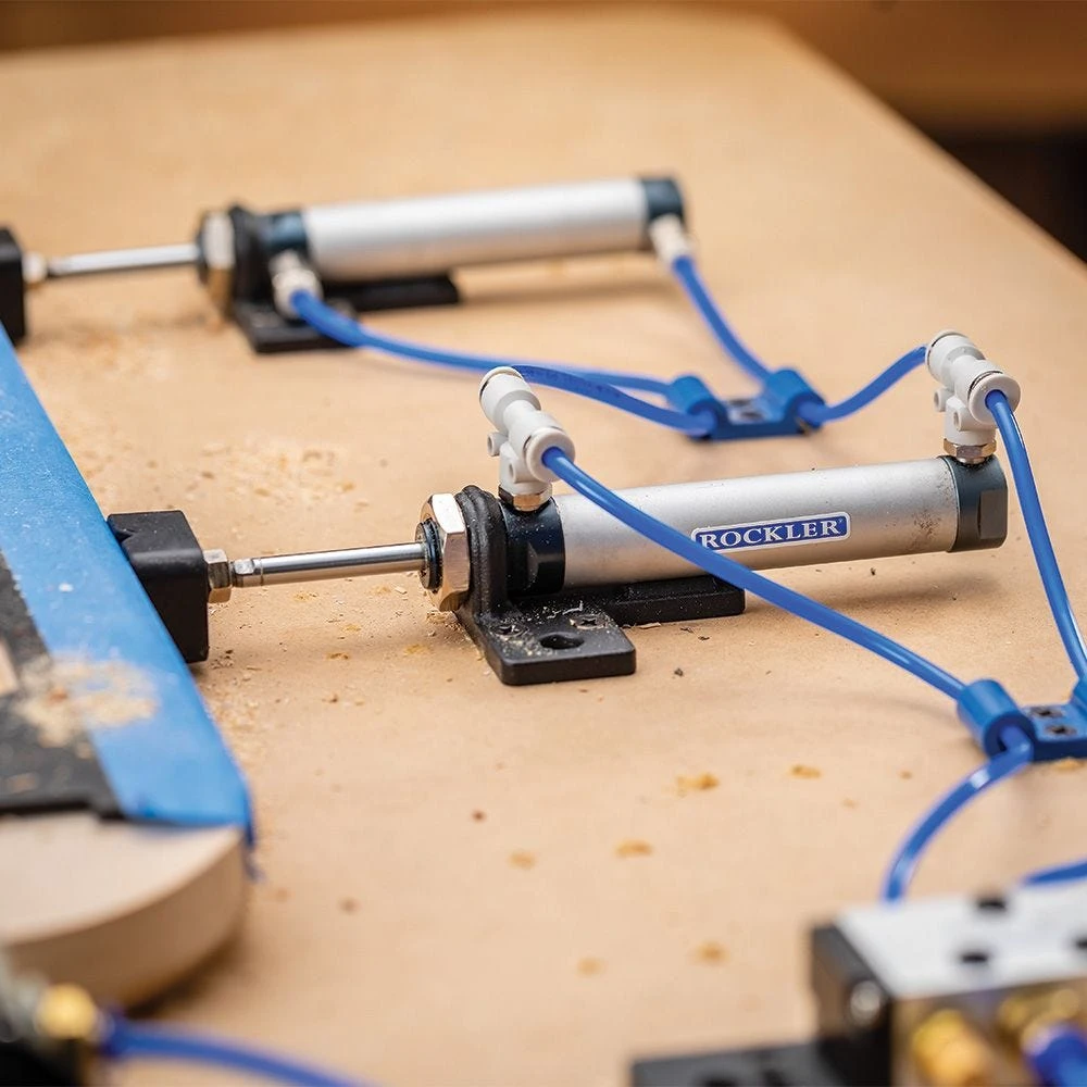 A flick of the switch is all it takes to provide strong clamping power—up to 34 pounds—with these pneumatic clamp kits. Their speed makes them ideal for repetitive clamping tasks, such as for face frame assembly, and as hold-downs or push clamps for drill presses and CNC tables. Rockler makes ordering easy with your choice of two all-in-one Starter Kits that include all the components* you need for either a vertical or horizontal clamp. You can then easily add additional clamps (up to 4 per regulator) by purchasing vertical or horizontal Expansion Kits (both types can use the same regulator and switch, at the same time). The clamps slide into standard T-track for easy adjustability, and they can also be screwed down for more permanent clamping fixtures.