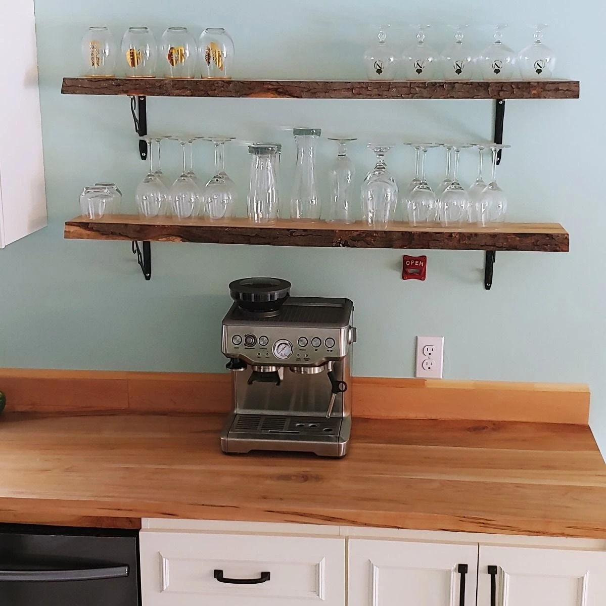 A single wavy edge with exposed bark gives this shelf a rustic appeal that works in a variety of decors. Each slab is cut from solid maple and planed on two faces, with a squared-off edge to the rear. The natural variations in the bark and the contours of the live edge show off the individuality of each piece. Width will vary from 5” to 8”.