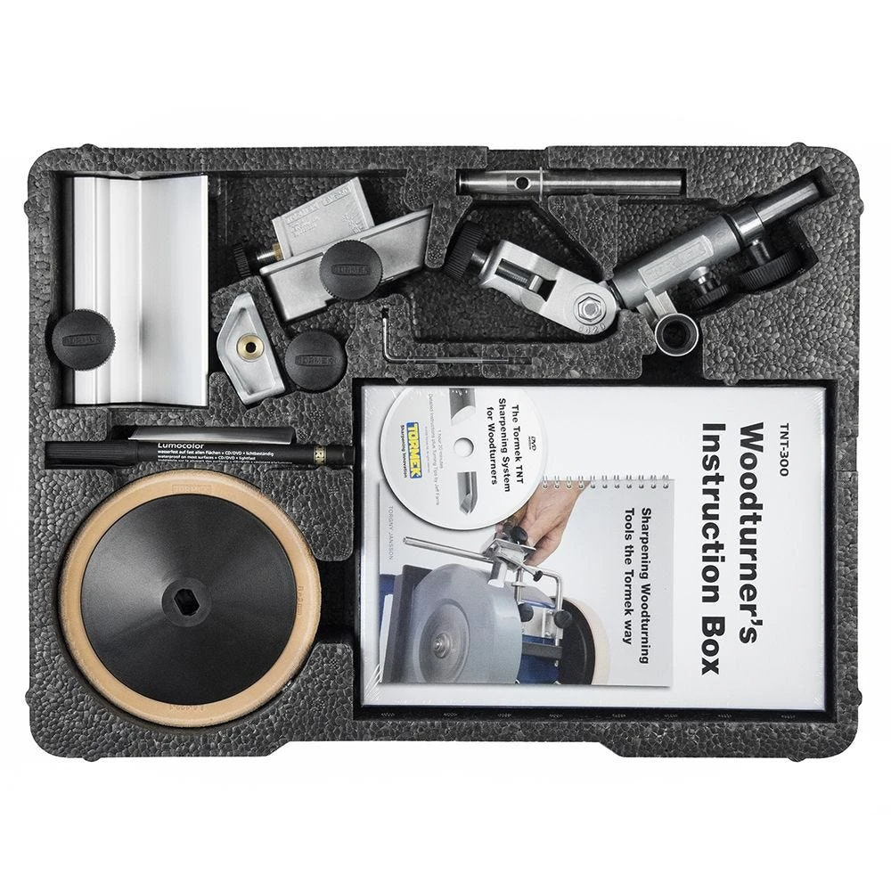 Everything you need to shape and sharpen all your turning tools with your Tormek Sharpening System. Includes two patented jigs (works like three!), a radiused leather honing wheel, a serious instructional book, the Turning Tool Setter and a Tormek Case with a sliding lid, premium leather handle and a foam organizer to protect all your jigs.